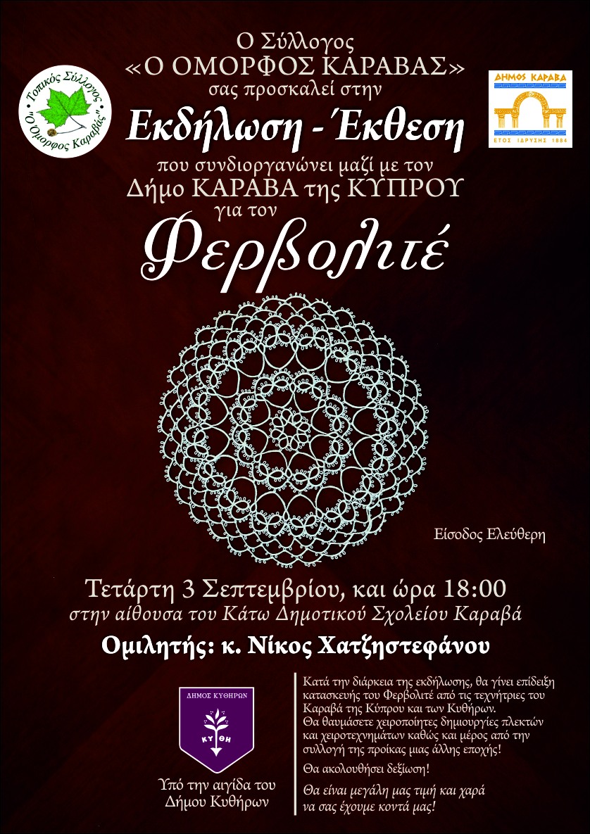 Το πρόγραμμα της εκδήλωσης θα περιλαμβάνει μεταξύ άλλων ομιλία από τον Δήμαρχο Καραβά και επίδειξη κατασκευής του φερβολιτέ από κεντήτριες του Δήμου Καραβά Κύπρου και του Καραβά Κυθήρων. Στα πλαίσια της εκδήλωσης θα υπάρχει έκθεση φερβολιτέ από τις δύο περιοχές.