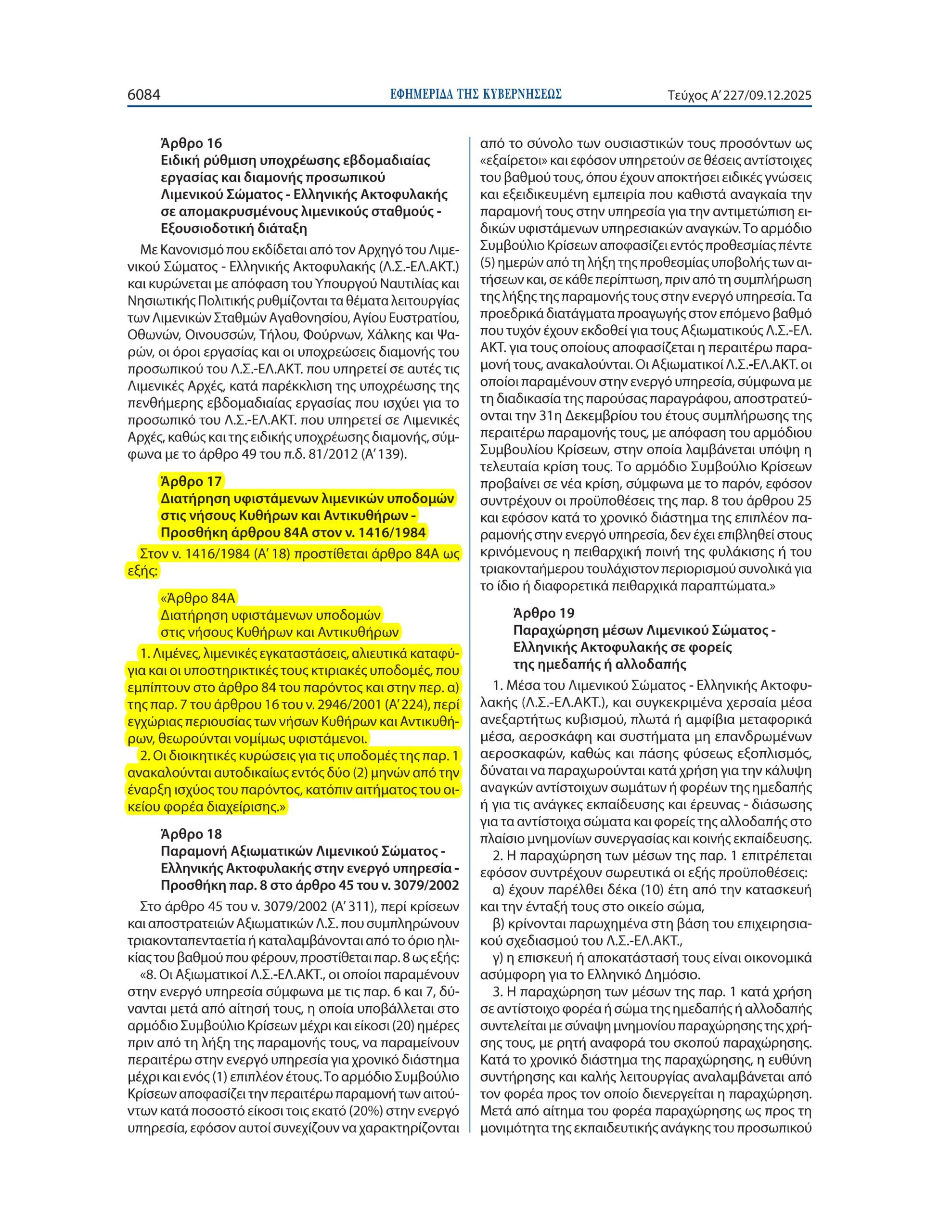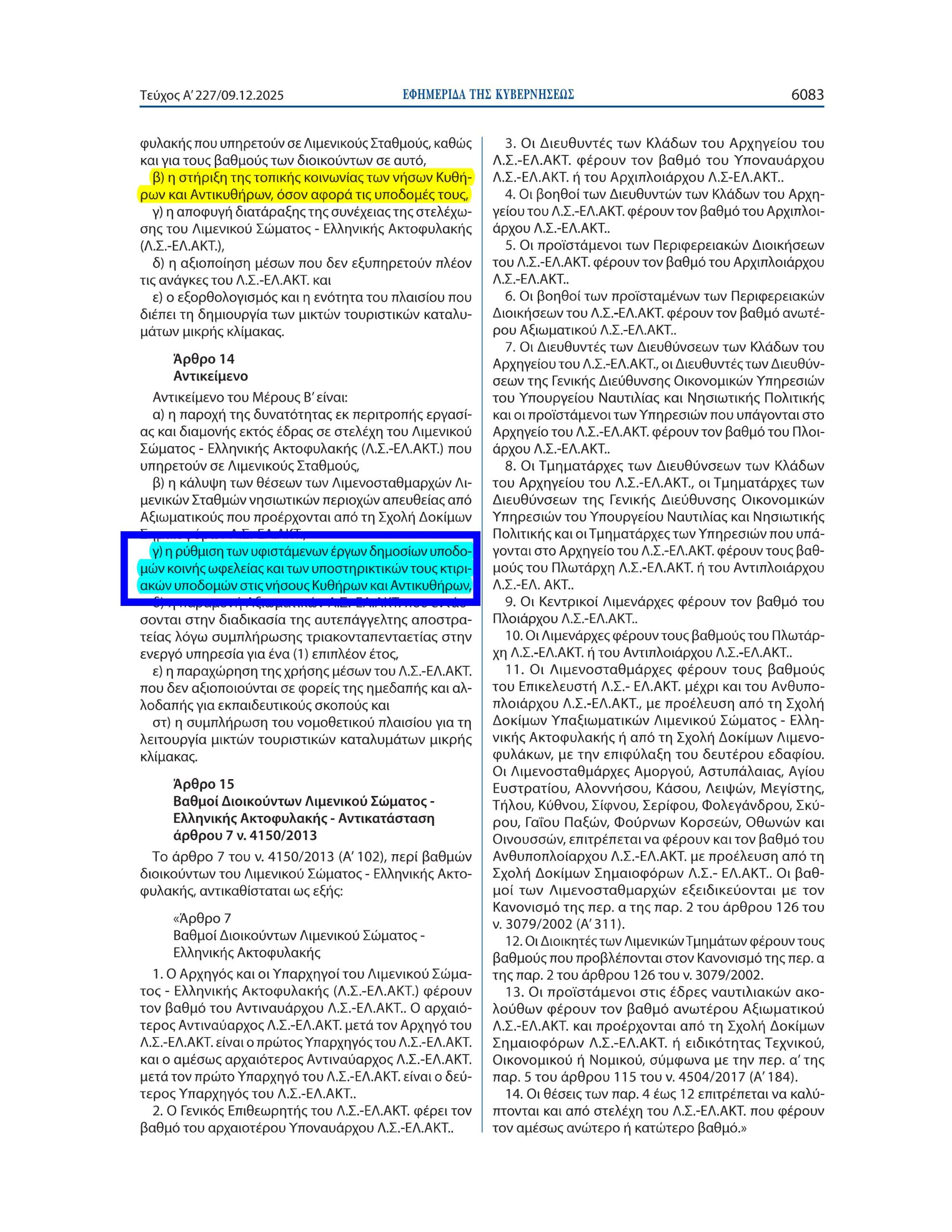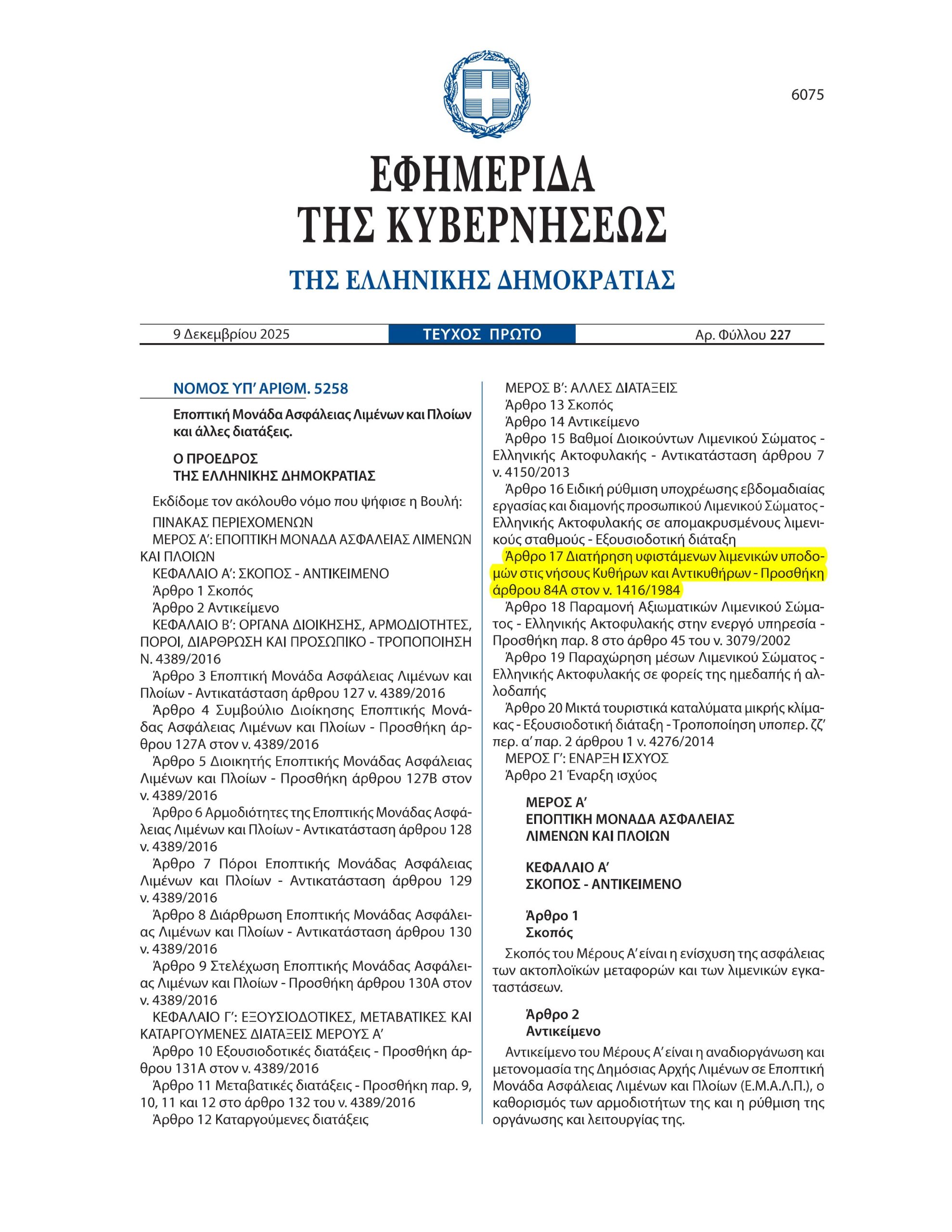 Ο Δήμος Κυθήρων είναι στην ευχάριστη θέση να ανακοινώσει ότι με το άρθρο 17 του Ν.5258/2025 «Εποπτική Μονάδα Ασφάλειας Λιμένων και Πλοίων και άλλες διατάξεις», που δημοσιεύθηκε στο ΦΕΚ με αρ. 227/τ.Ά/09-12-2025 και ύστερα από τη σχετική ψήφιση του Νόμου από την Ολομέλεια της Βουλής των Ελλήνων, επιλύεται οριστικά το ζήτημα της νομιμοποίησης των λιμενικών υποδομών στις νήσους Κύθηρα και Αντικύθηρα, το οποίο ταλάνιζε το Δήμο μας για πάνω από 20 χρόνια. Πρόκειται για υλοποίηση της δέσμευσης του Πρωθυπουργού κ. Κυριάκου Μητσοτάκη προς το Δήμαρχο Κυθήρων κ. Στράτο Χαρχαλάκη κατά τη σύσκεψη για τα Κύθηρα στο Μέγαρο Μαξίμου στις 29-07-2025. Η ρύθμιση καθώς και η αιτιολογική της έκθεση προετοιμάστηκαν με ευθύνη του Γ.Γ. του Υπουργικού Συμβουλίου κ. Στέλιου Κουτνατζή, ενώ υπήρξε διαρκής συνεργασία του Δημάρχου με τα συναρμόδια Υπουργεία. Ιδιαίτερες ευχαριστίες απευθύνονται: καταρχήν στον ίδιο τον Πρωθυπουργό κ. Κυριάκο Μητσοτάκη, καθώς και στον Υπουργό Εσωτερικών κ. Θεόδωρο Λιβάνιο, στον Υπουργό Ναυτιλίας κ. Βασίλη Κικίλια, στον Υφυπουργό Κλιματικής Κρίσης κ. Κώστα Κατσαφάδο και στον Υφυπουργό Ναυτιλίας κ. Στέφανο Γκίκα για τη θετική συμβολή τους. Η ρύθμιση ικανοποιεί ένα πάγιο αίτημα του Δήμου μας που έχει εκφραστεί με πληθώρα εγγράφων από το 2015 μέχρι σήμερα, με τα οποία τεκμηριώθηκε η ανάγκη νομιμοποίησης των λιμένων του Δήμου Κυθήρων με ειδική διάταξη Νόμου. Η νομιμοποίηση που επιτεύχθηκε αφορά το σύνολο των λιμένων, λιμενικών υποδομών, αλιευτικών καταφυγίων και των κτιριακών τους εγκαταστάσεων, που στην πλειονότητά τους κατασκευάστηκαν προ δεκαετιών από κρατικούς φορείς ή την Περιφέρεια/Νομαρχία χωρίς να διαθέτουν τις σχετικές εγκρίσεις, σε περιόδους όπου το Κράτος θεωρούσε ότι τα δημόσια έργα απαλλάσσονται της έκδοσης αδειών. Πλέον, επιλύεται μια από τις σοβαρότερες εκκρεμότητες του παρελθόντος, θωρακίζεται ακόμα περισσότερο ο θεσμός της Εγχώριας Περιουσίας και δίνεται η δυνατότητα στο Δήμο και το Λιμενικό Ταμείο να υλοποιήσουν σημαντικά έργα υποδομής στα λιμάνια μας, ενώ άμεσα θα προχωρήσουν οι διαδικασίες μίσθωσης των χώρων στο Λιμένα Διακοφτίου (ΚΥΕ, 2 πρακτορεία, επιχειρήσεις ενοικιαζομένων ΙΧ κ.λπ.) καθώς και νέας μίσθωσης με αυξημένο ενοίκιο στο κτήριο του Λιμένος Καψαλίου που μισθώνει το Υπουργείο Οικονομικών για το Τελωνείο και βασίζεται σε μισθωτήριο του 1998 που δεν μπορούσε να ανανεωθεί λόγω της υποχρέωσης πολεοδομικής τακτοποίησης του κτηρίου που επιτεύχθηκε με τη ρύθμιση.