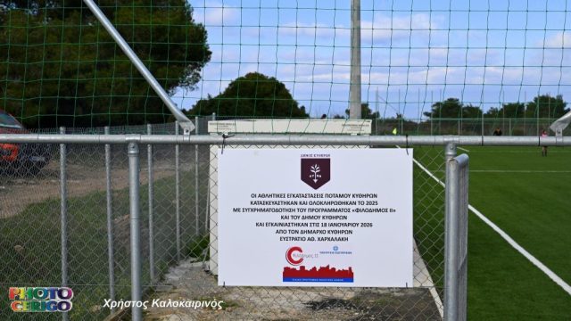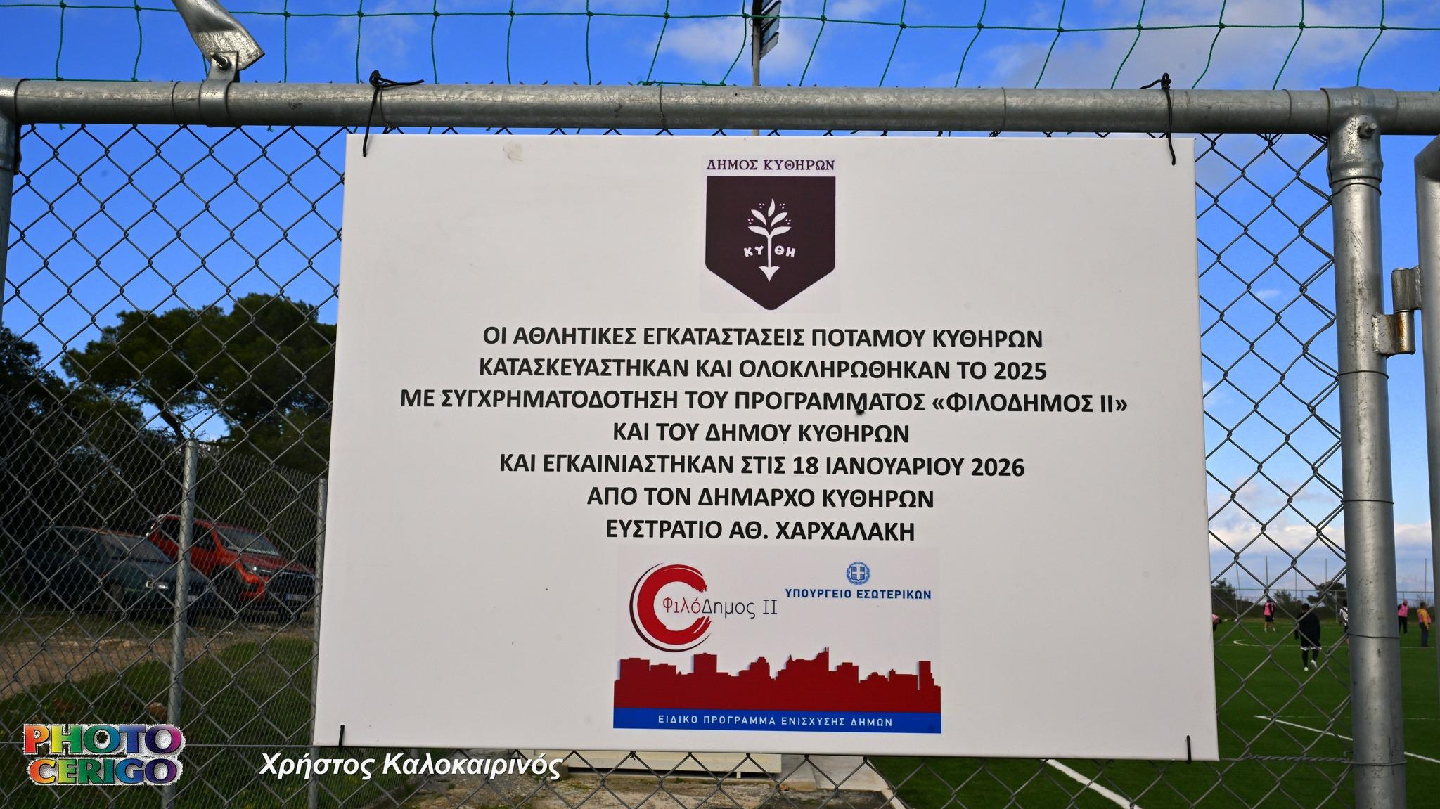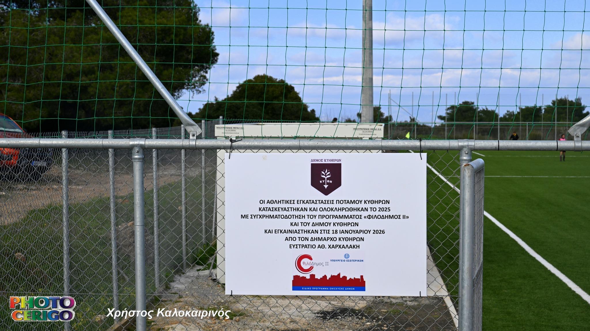 Μέσα σε κλίμα χαράς και ικανοποίησης, παρά το δριμύ ψύχος, δεκάδες κάτοικοι των Κυθήρων παρακολούθησαν την Κυριακή 18/1/26 την τελετή εγκαινίων του νέου Δημοτικού Γηπέδου Ποδοσφαίρου στον Ποταμό, που παραδόθηκε πλέον προς χρήση των αθλουμένων κάθε ηλικίας. Τον Αγιασμό τέλεσε ο Σεβ. Μητροπολίτης Κυθήρων και Αντικυθήρων κ. Σεραφείμ που επαίνεσε τις προσπάθειες της Δημοτικής Αρχής για την αναβάθμιση των αθλητικών υποδομών στο νησί. Ο Δήμαρχος Κυθήρων κ. Στράτος Χαρχαλάκης τόνισε ότι πέρα και πάνω από τη θέληση του Δήμου για την κατασκευή έργων υποδομής, βρίσκονται τα γρανάζια της γραφειοκρατίας που μέσα από δαιδαλώδεις διαδικασίες, συχνά ανούσιες, οδηγούν σε μεγάλες καθυστερήσεις την ολοκλήρωση τόσο σημαντικών έργων.